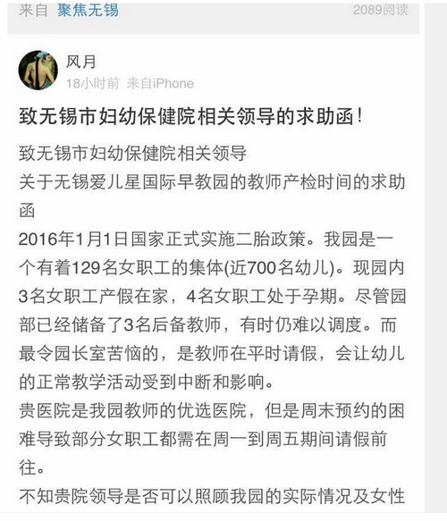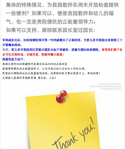 近日,我院收到了无锡爱儿星国际早教园的教师产检时间的求助函。在了解到实际情况后,我院第一时间与该园取得了联系,同时针对该园所提出的问题,医院也进行了及时解决,开通绿色通道,圆满的解决了群众难题。